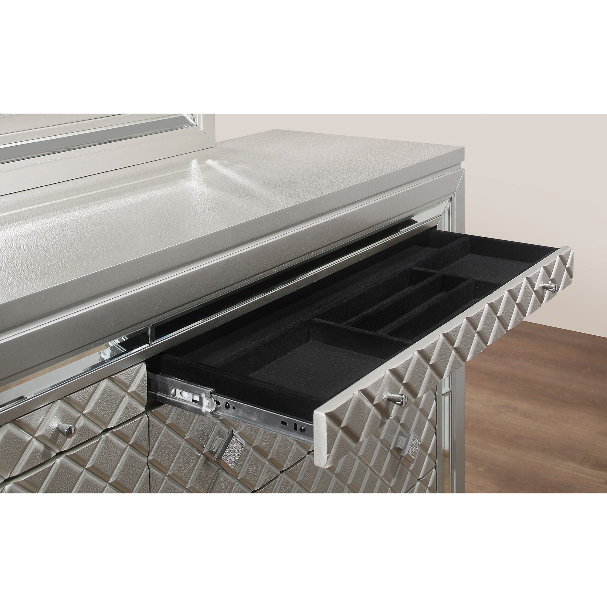 - Elegant Design: Jewel embellished hardware and mirror accents add a touch of luxury.