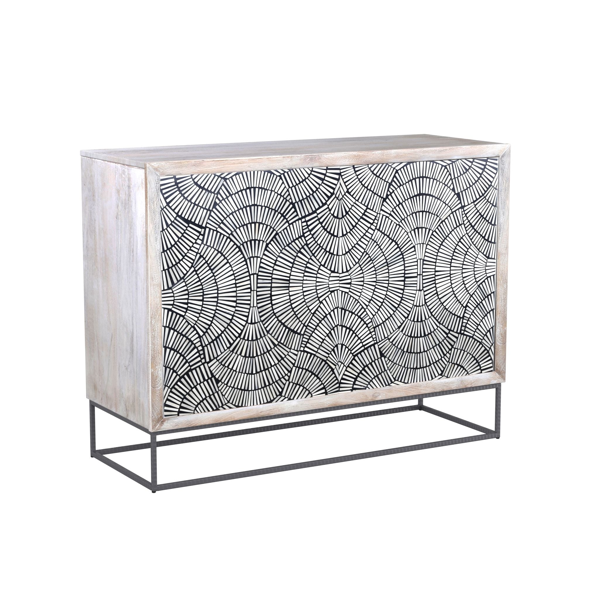 The Magnolia bar cabinet embodies a fusion of modern and bohemian styles, making it a standout piece in any space. Crafted from solid mango wood with a white-wash finish, its frame exudes a rustic yet refined charm. The touch-release doors reveal an intricately-patterned design crafted from contrasting bone and resin, adding an artistic flair. Supported by a textured solid iron base, the cabinet's interior features a crisp white finish and offers a variety of storage options for your bar essentials. As mango and bone are natural materials, each piece boasts unique variations in color, texture, and finishing, ensuring that your cabinet is one-of-a-kind. Elevate your home bar with this stylish and functional statement piece, perfect for those who appreciate modern design and natural materials.