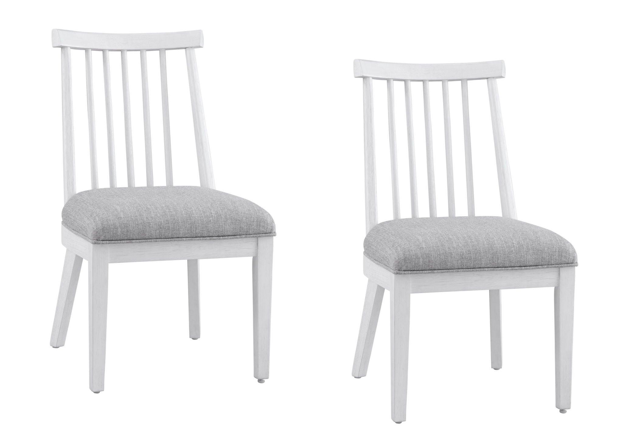 The Nadine Dining Chair features a coastal contemporary inspired design and is constructed with solid wood in a bright white oak finish with a spindle back design in a durable light gray fabric seat.