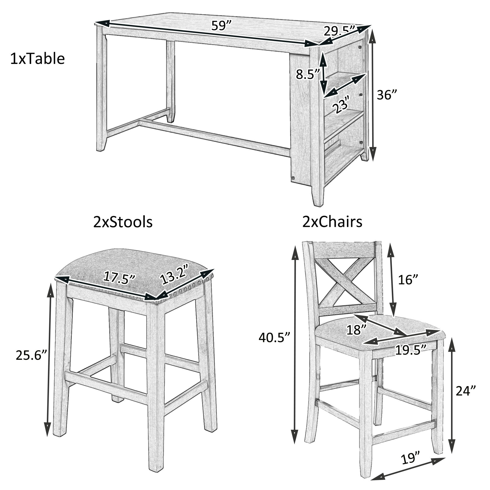 - Dimensions and Packaging: Table measures 59x29.5x36 inches, chairs 19.5x18x40.5 inches, and stools 17.5x13.2x25.6 inches. Set is shipped in three packages that may arrive separately.