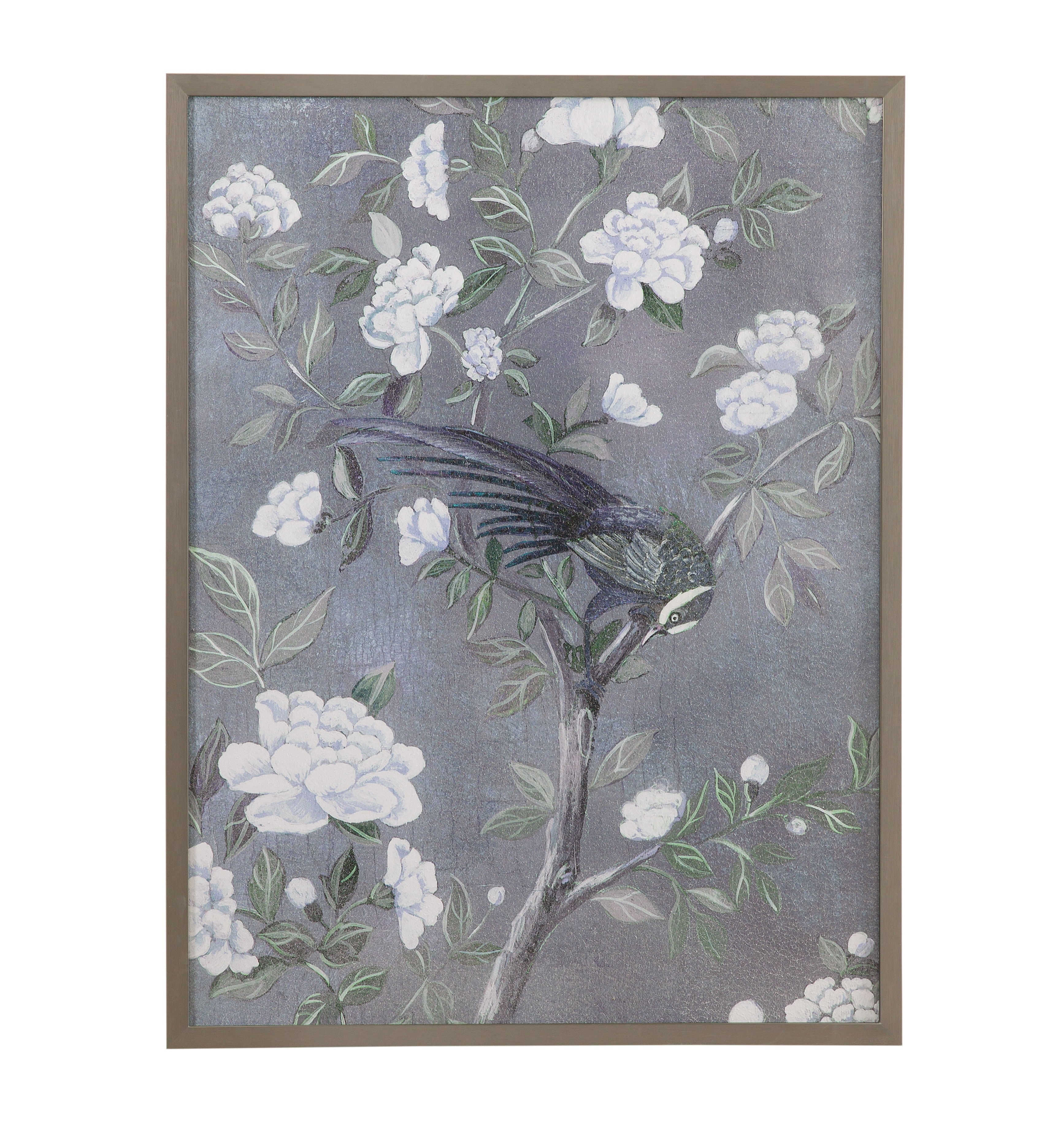 Birds and Bloom II is a print framed in a 1" pewter shadow box molding and features a special textured finish giving the effect of an original canvas artwork.