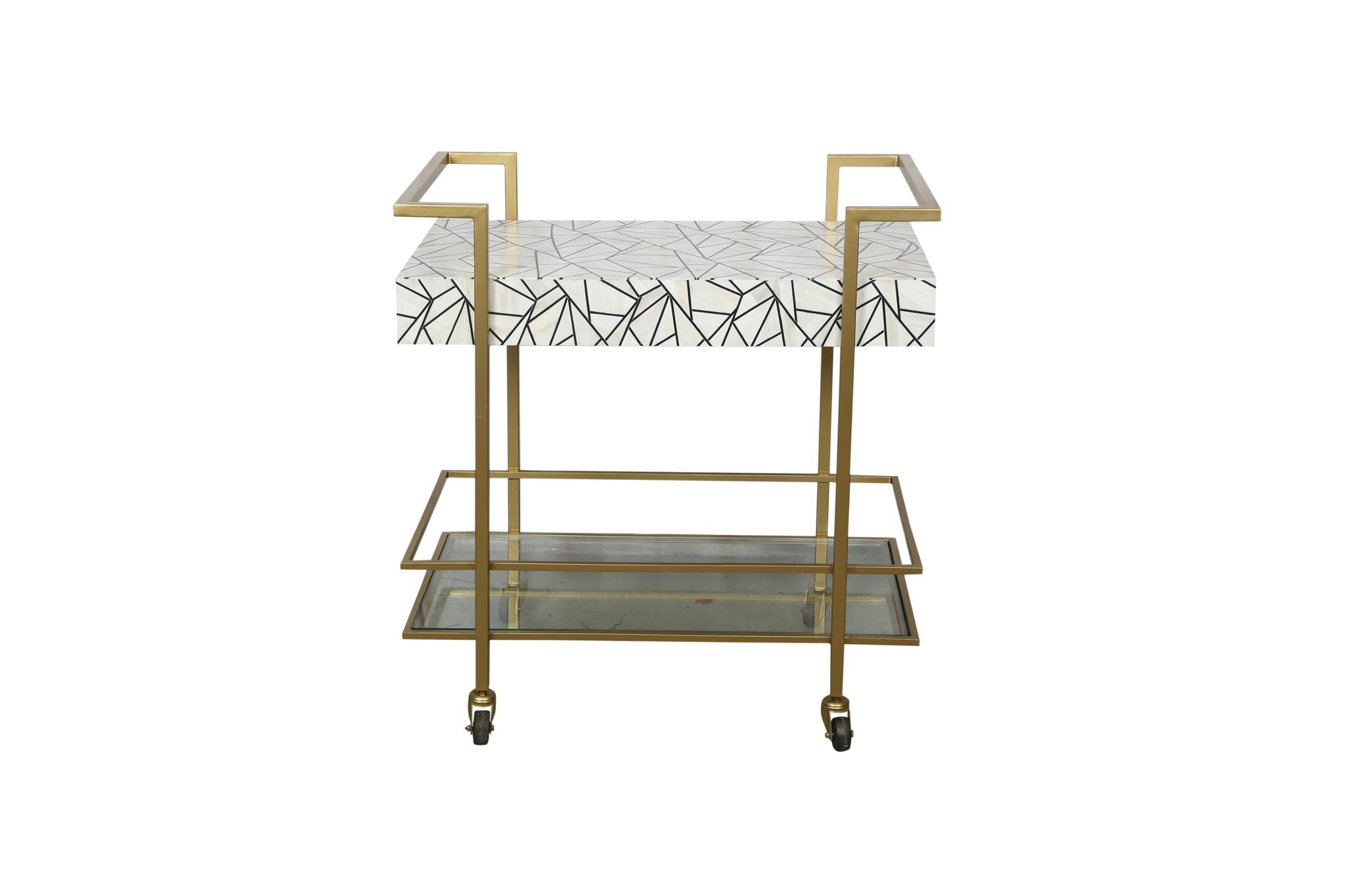 The Bottoms Up Bar Cabinet is a striking, modern-inspired statement piece. Its serving surface features a bold geometric pattern, crafted from contrasting ivory bone and black resin. The sleek iron frame is finished in a refined brushed gold, while the base incorporates a clear tempered glass shelf and casters for enhanced mobility.