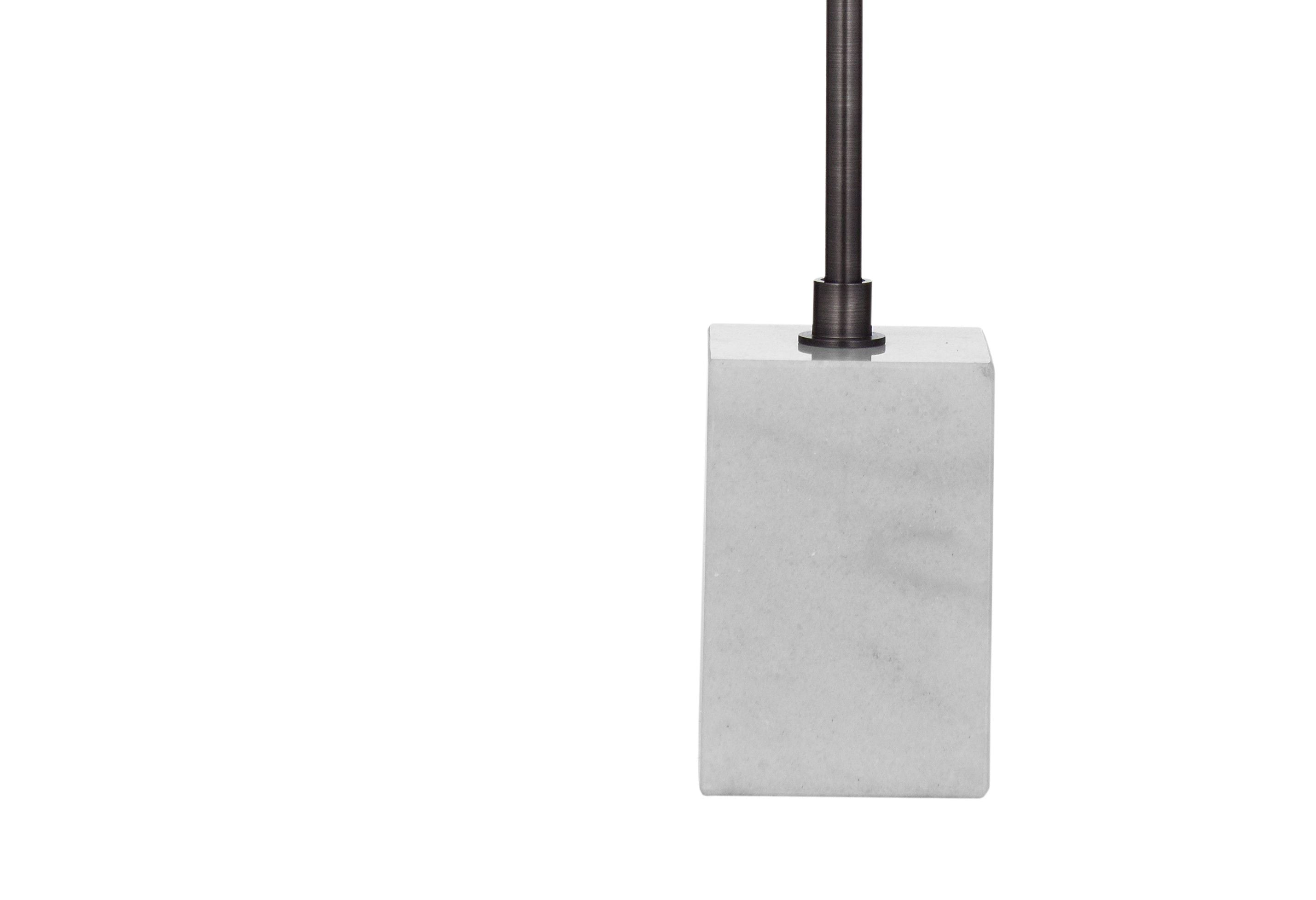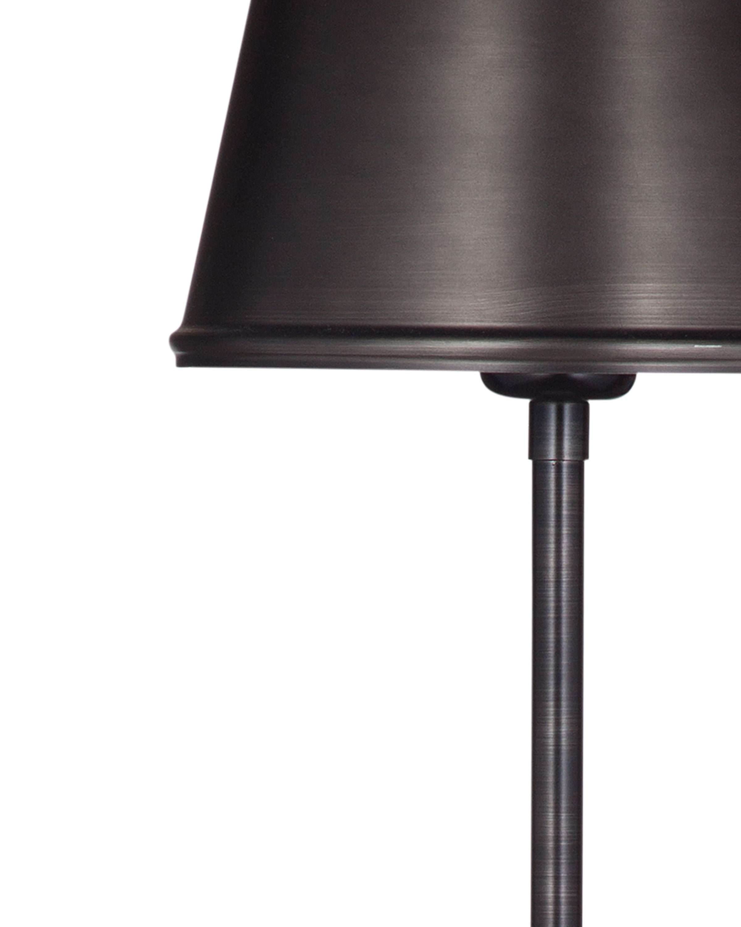 The Gunmetal Table Lamp is crafted of metal and marble with a tapered metal shade.