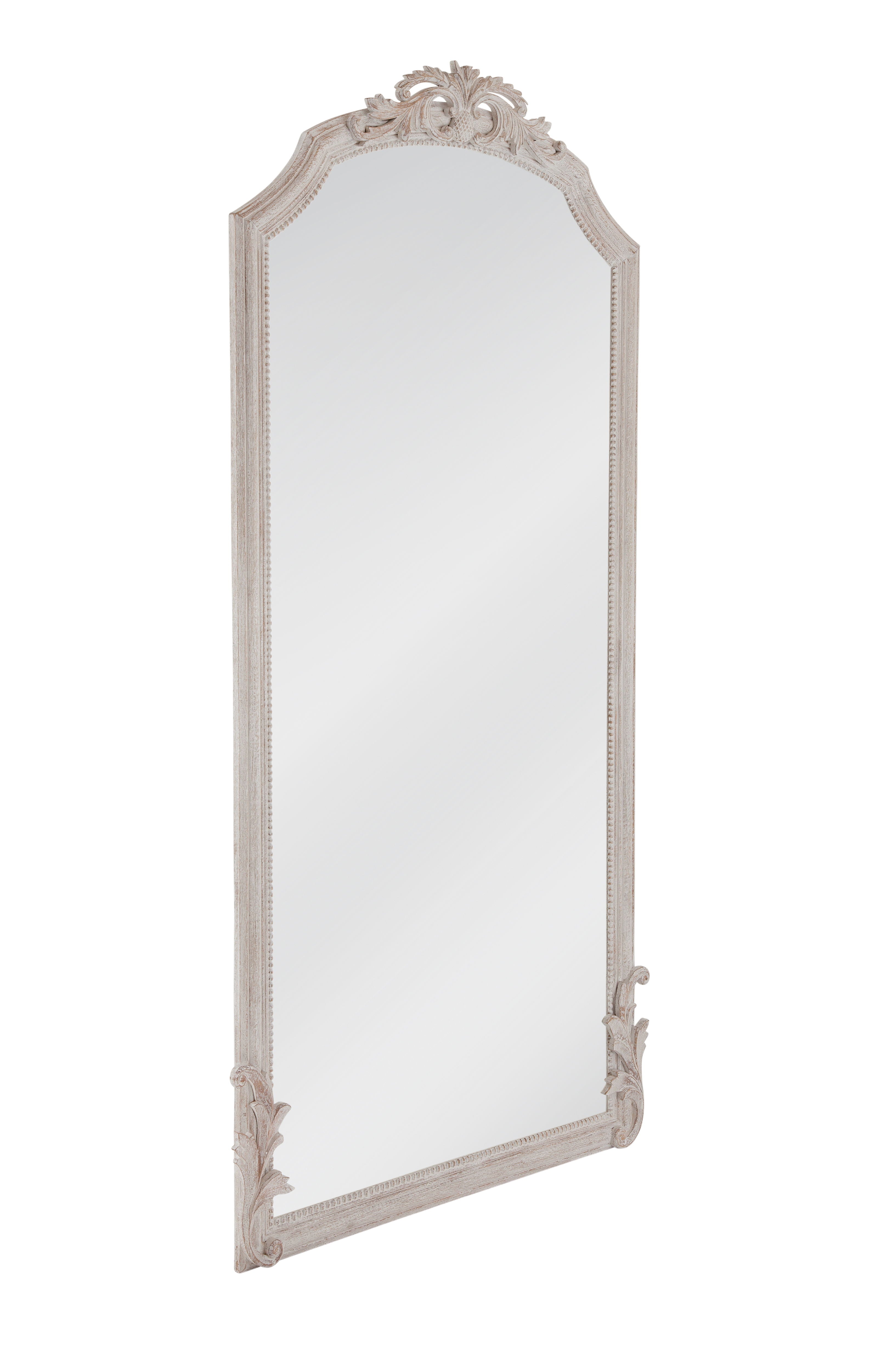 The Coltrane Floor Mirror combines elegance and charm with its rectangular shape and arched decorative pediment top. Ornate details on the base sides enhance its sophistication. Crafted from wood and finished in distressed white, it exudes timeless farmhouse appeal.
