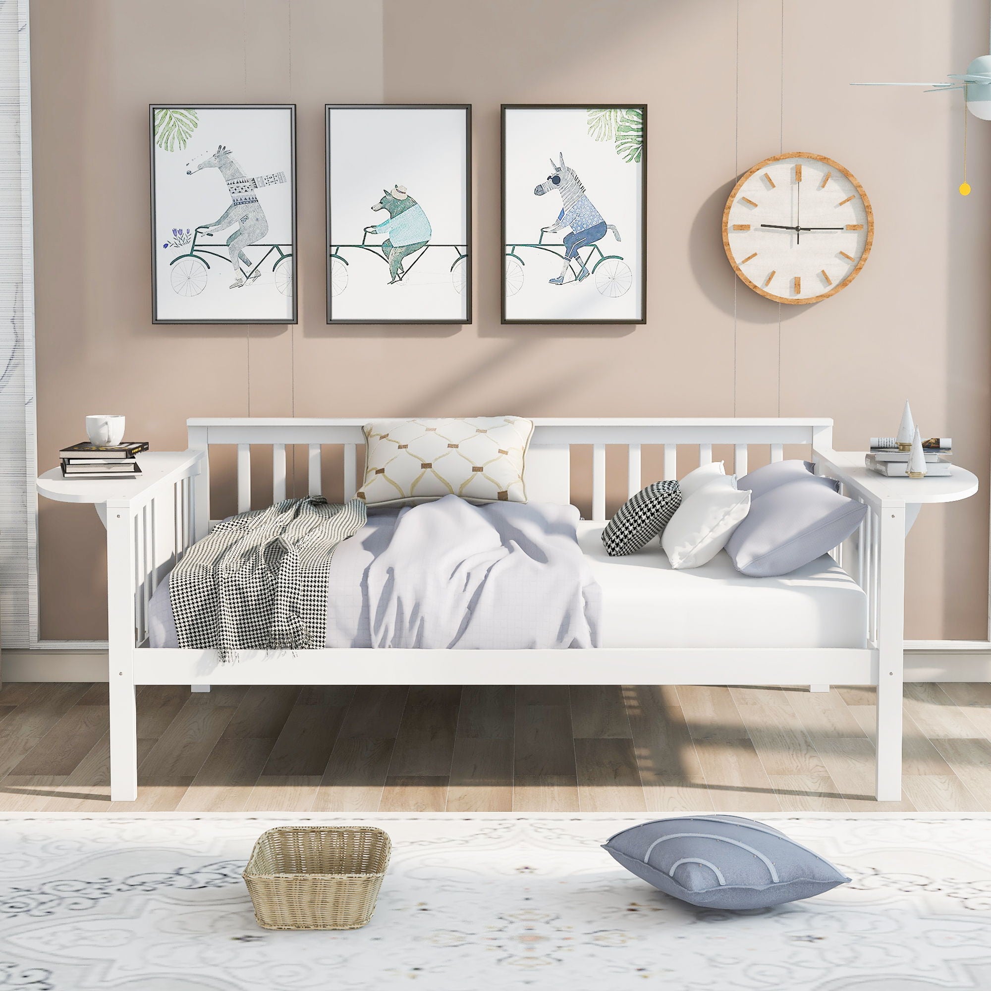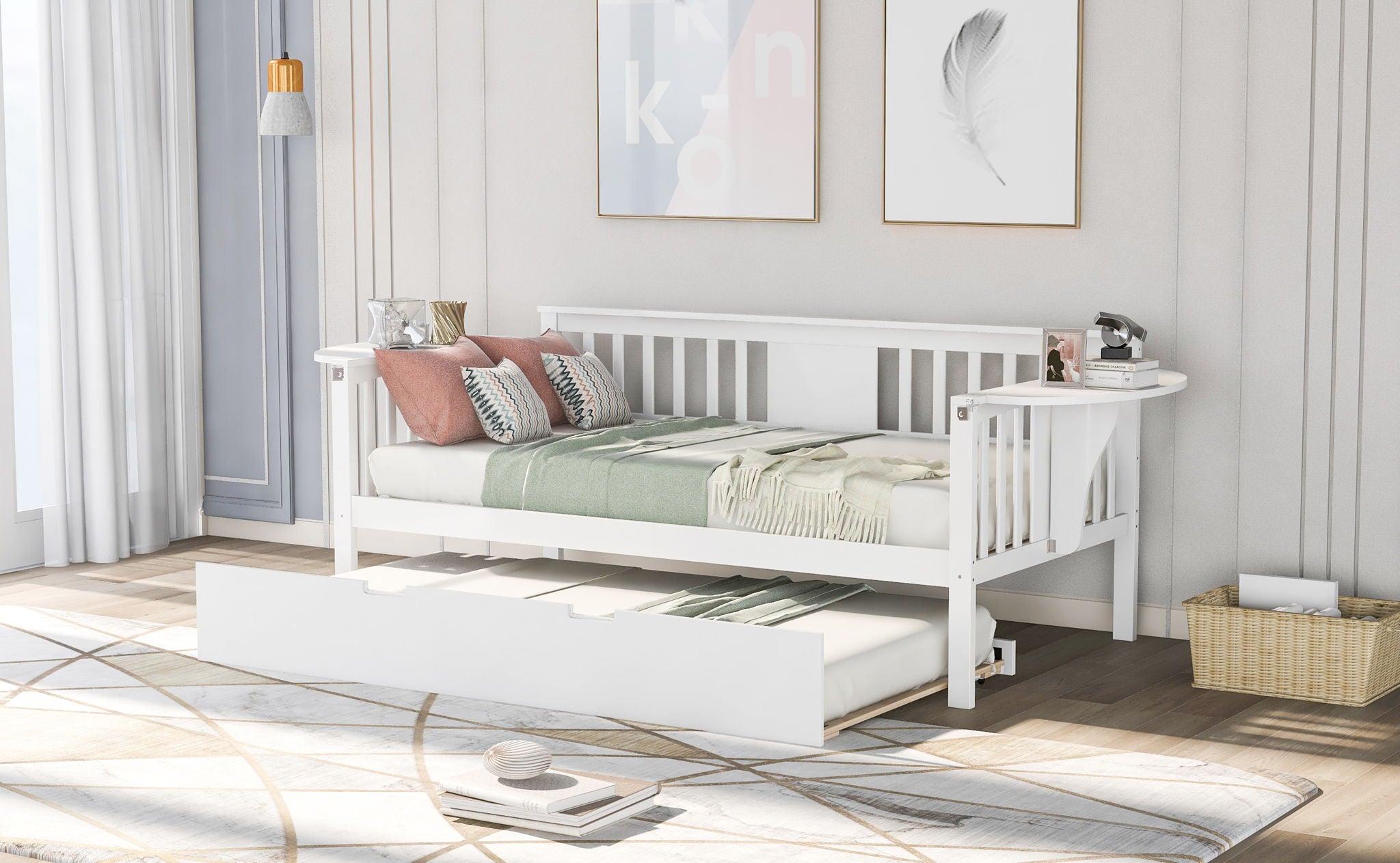 Multi-functional Design: The daybed frame with rails on three sides can serve as a bed in your bedroom, or as a sofa or seat in your living room. With small, foldable tables on the left and right, you can conveniently place a cup of coffee or a book within reach. It perfectly meets your different needs.