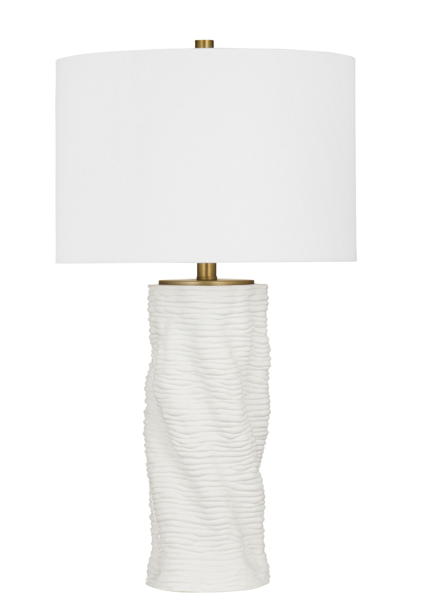 The Delancy Table Lamp showcases a modern contemporary design with an organic, sculptural base in a matte white finish. Brass accents add a refined contrast, while the crisp white drum shade completes the look. This piece brings clean lines and subtle texture together, making it a sophisticated addition to any room.