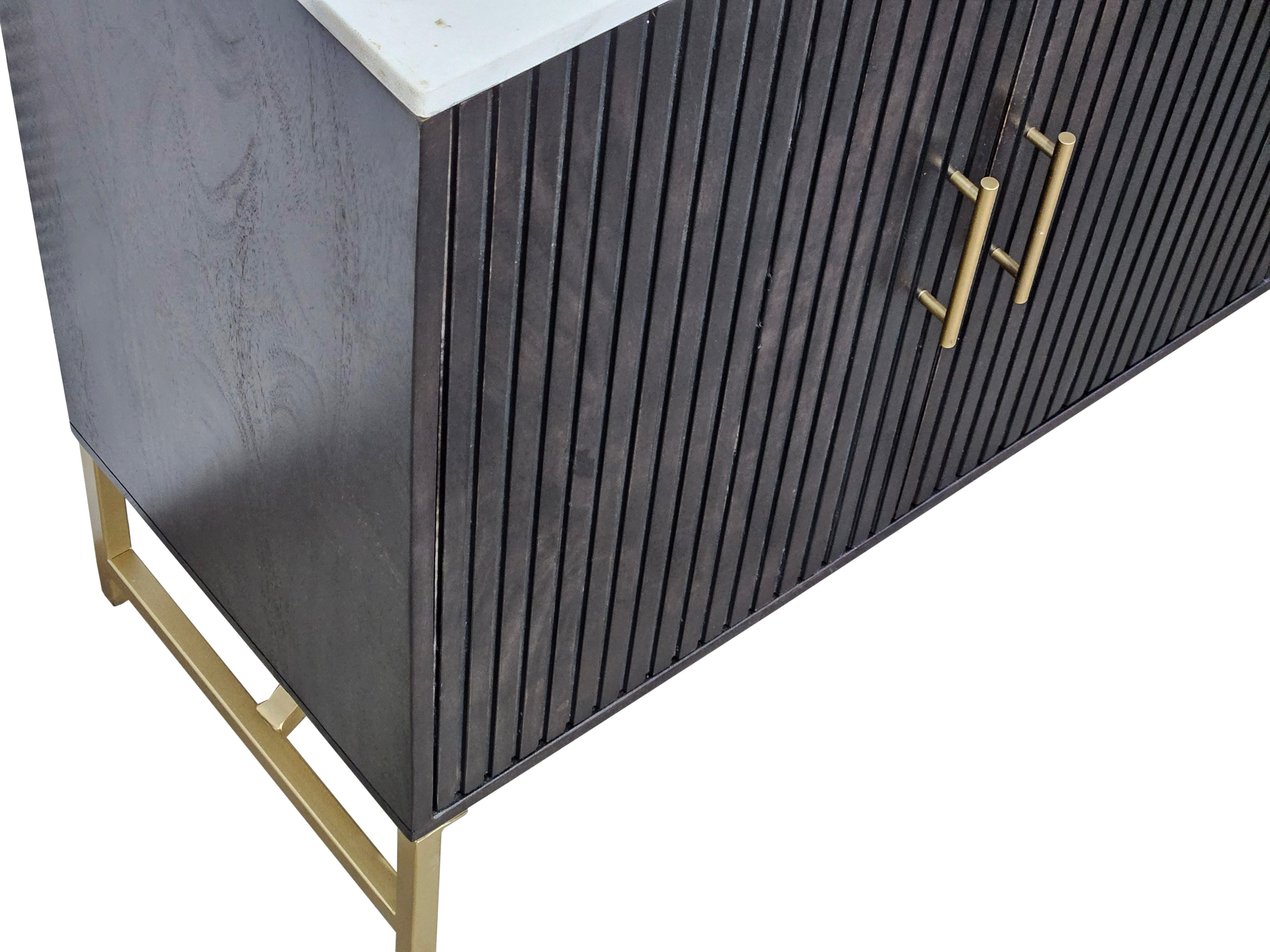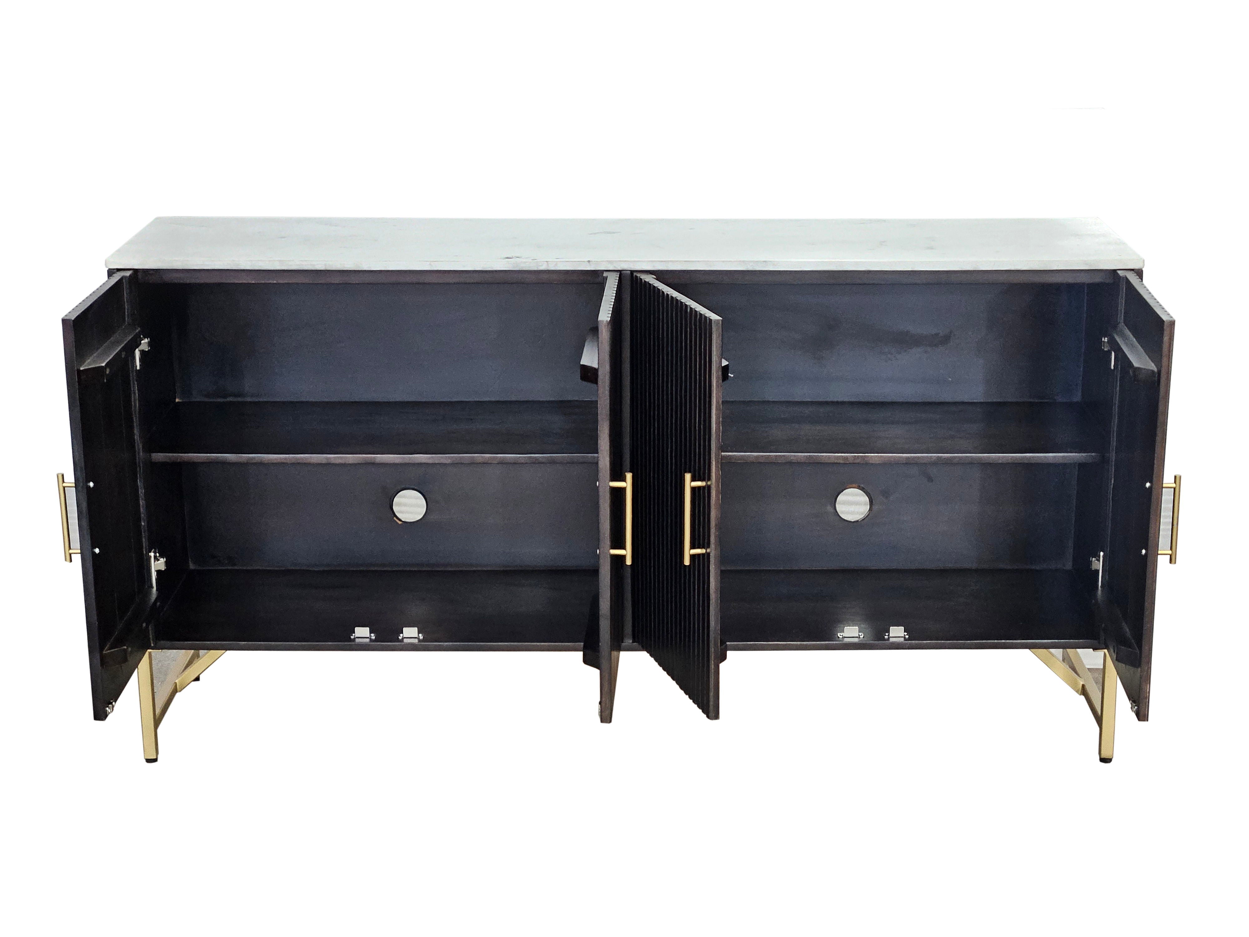 The Dupont Server is a modern-inspired beauty, featuring a striking mix of materials and finishes. The case frame is crafted from solid mango wood in a rich brown finish, complemented by a white Indian marble top and a brushed gold metal base and hardware for a luxurious contrast. The reeded doors add texture and visual appeal, elevating the overall design. Inside, the four doors reveal adjustable shelves and media cord management, combining form and function in a beautifully crafted piece.