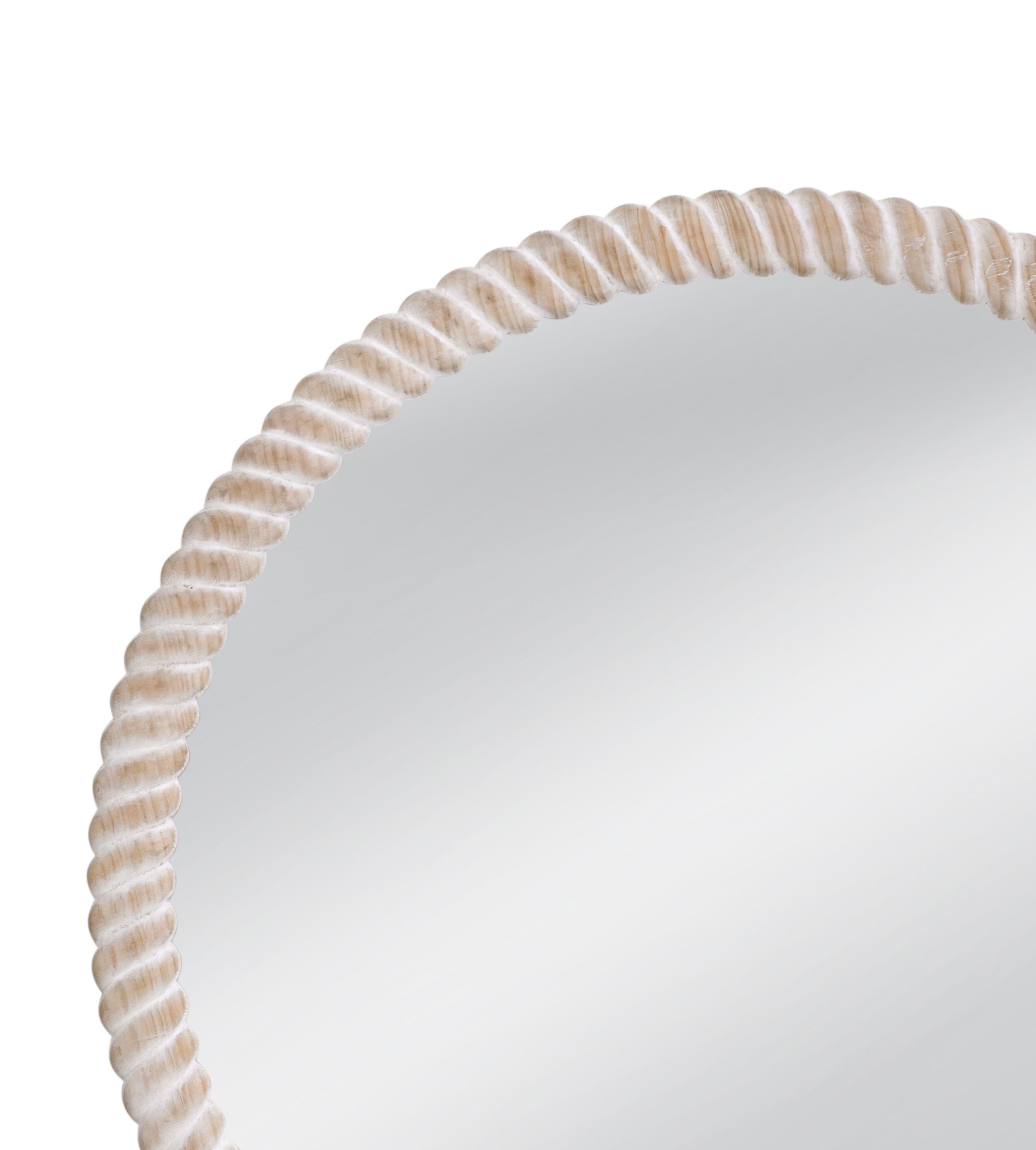 The Ely Wall Mirror boasts a charming round frame adorned with a rustic rope motif, creating a warm and inviting focal point for any room. Finished in a weathered white tone, it exudes timeless elegance while adding a touch of coastal charm to your living space. Crafted with attention to detail, this mirror effortlessly blends style and functionality to enhance your home decor with its subtle yet distinctive appeal.