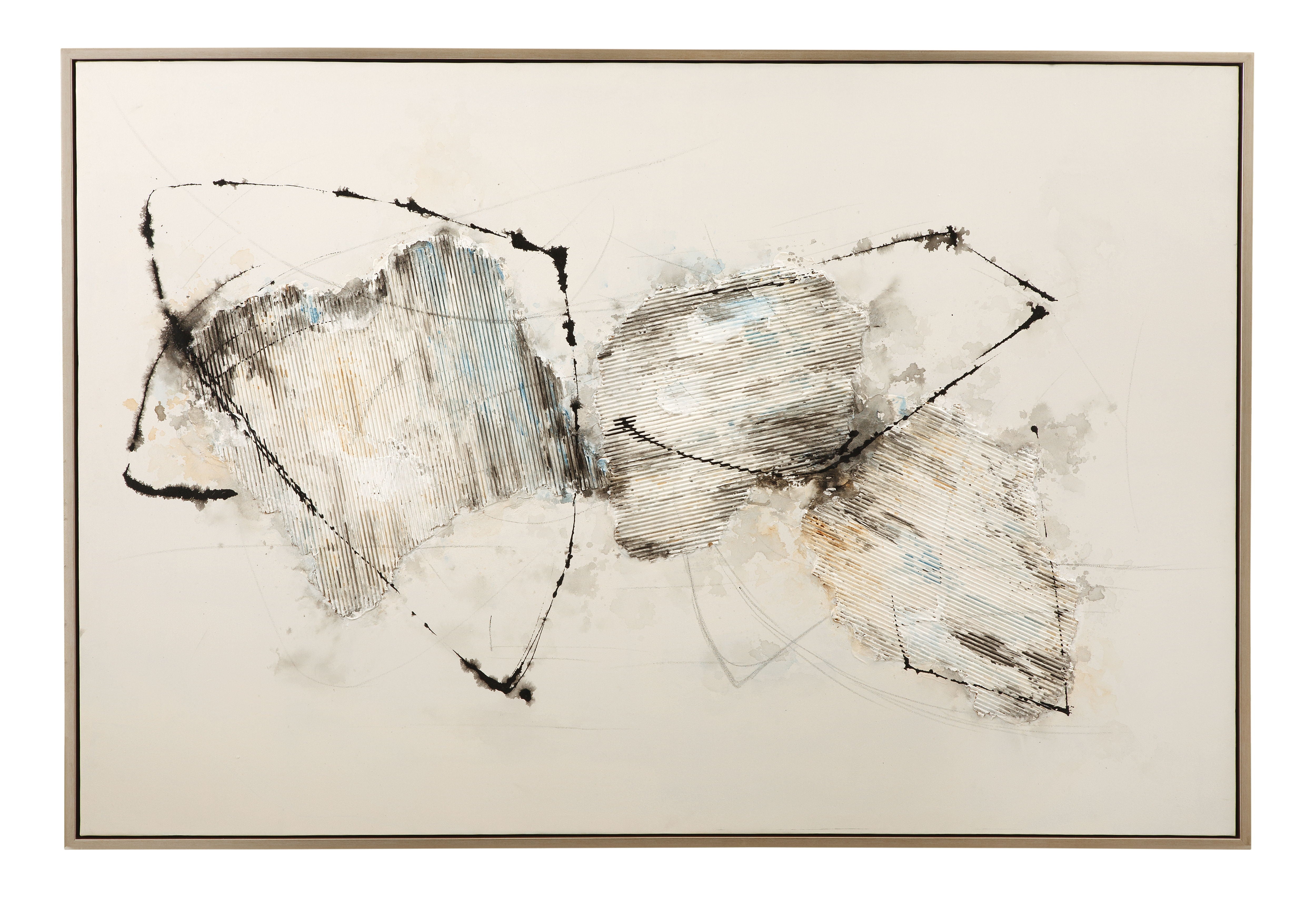 The Gascon framed canvas embodies contemporary elegance. Cool tone abstract brush strokes on an off white background wrapped in a sleek silver frame.