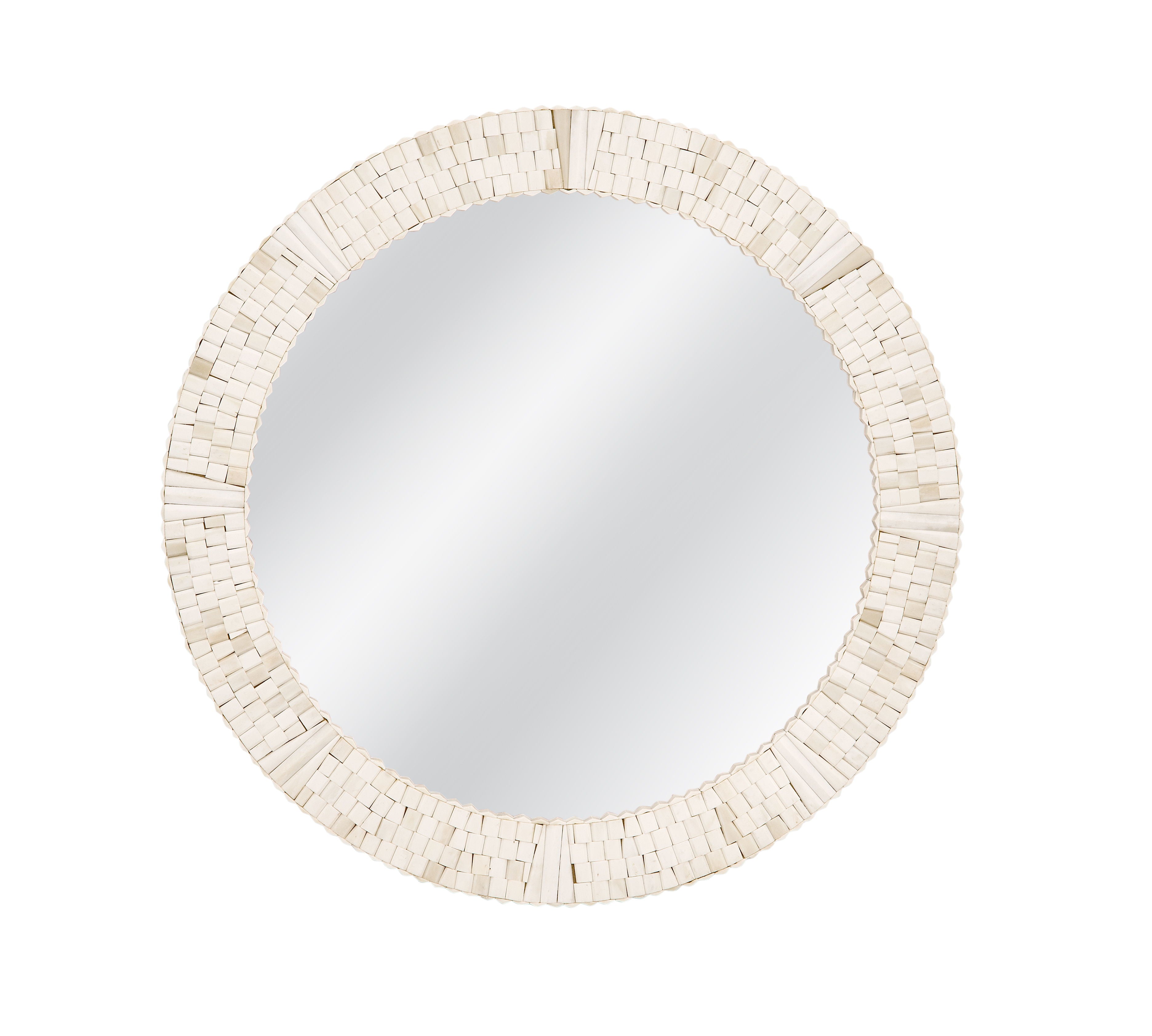 The Getty Wall Mirror features an intricately crafted frame made of bone pieces in a natural cream finish, offering a refined artisanal touch. Its unique detailing and soft palette bring warmth and texture to any space, blending effortlessly with both modern and traditional decor.
