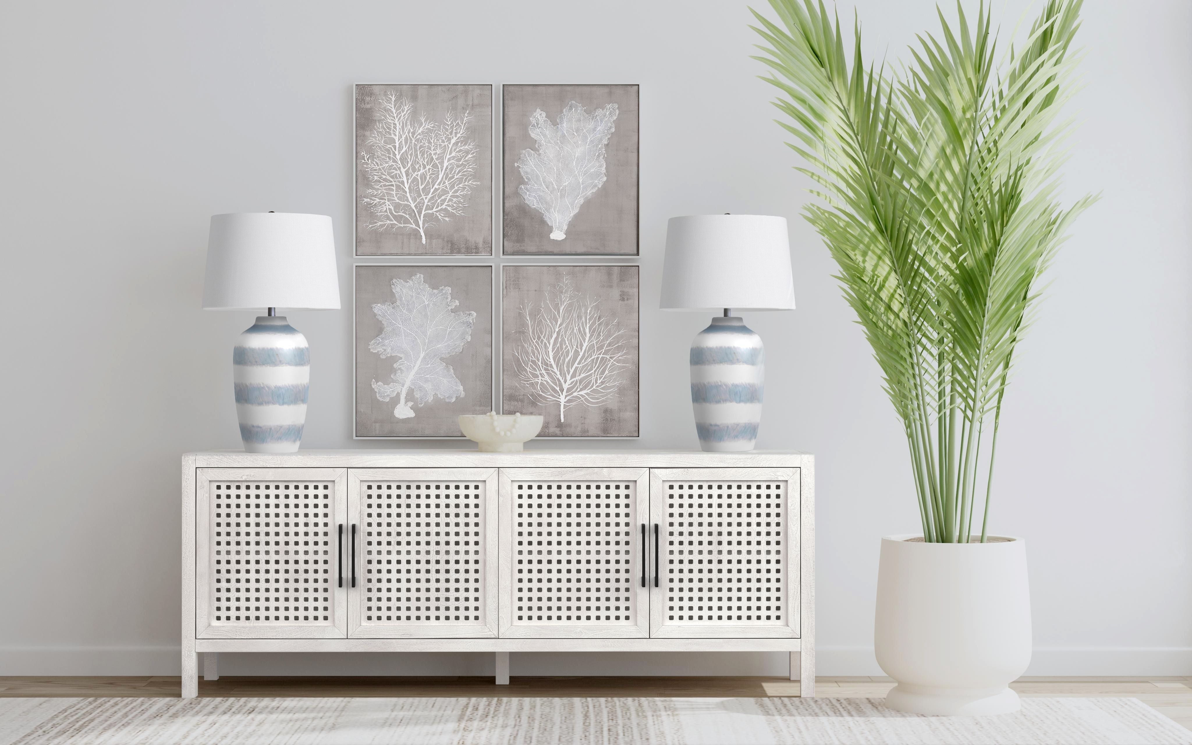 The Harper Table Lamp boasts a ceramic body with a visually soothing pattern of horizontal blue stripes, reminiscent of serene ocean waves or soft brushstrokes on canvas. This artistic element is capped with a simple white lampshade, ensuring that the lamp provides a subtle yet compelling visual interest and a calming light in any room it's placed. It's an ideal choice for spaces that aim to create a peaceful atmosphere with a hint of coastal inspiration.