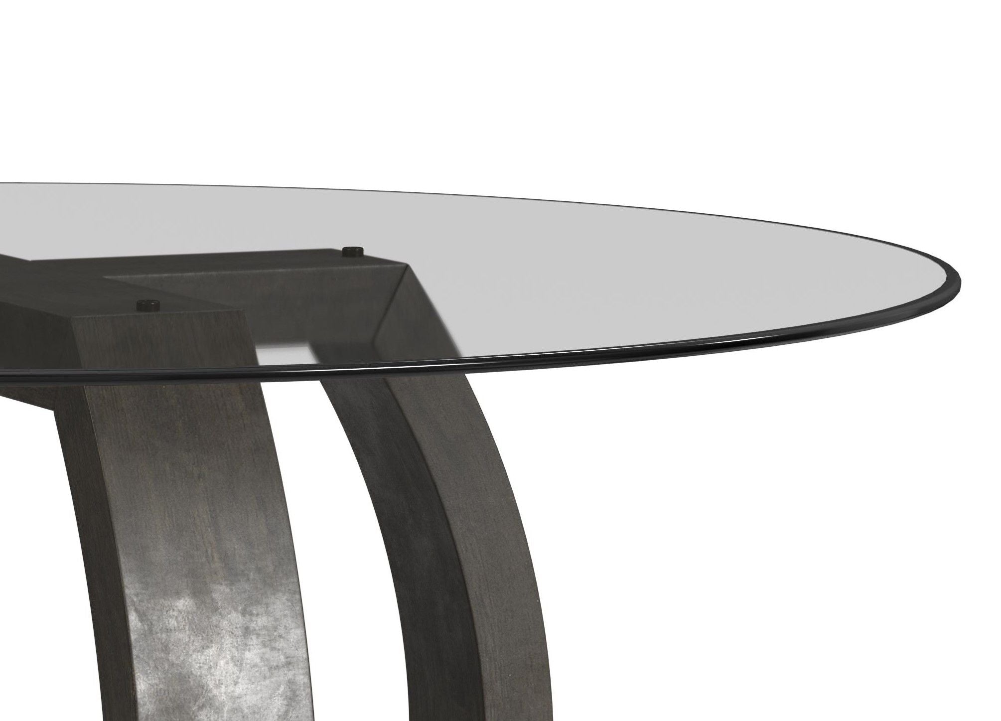 The Kellan Dining Table features a modern and transitional design. The table base is constructed with wire-brushed solid rubberwood and features a modern, transitional design. Finished in a cerused charcoal with deep chocolate undertones. Features a 3/8" thick clear glass top with a shaped eurogee edge treatment. The table measures 48" round and will comfortably seat a party of four.