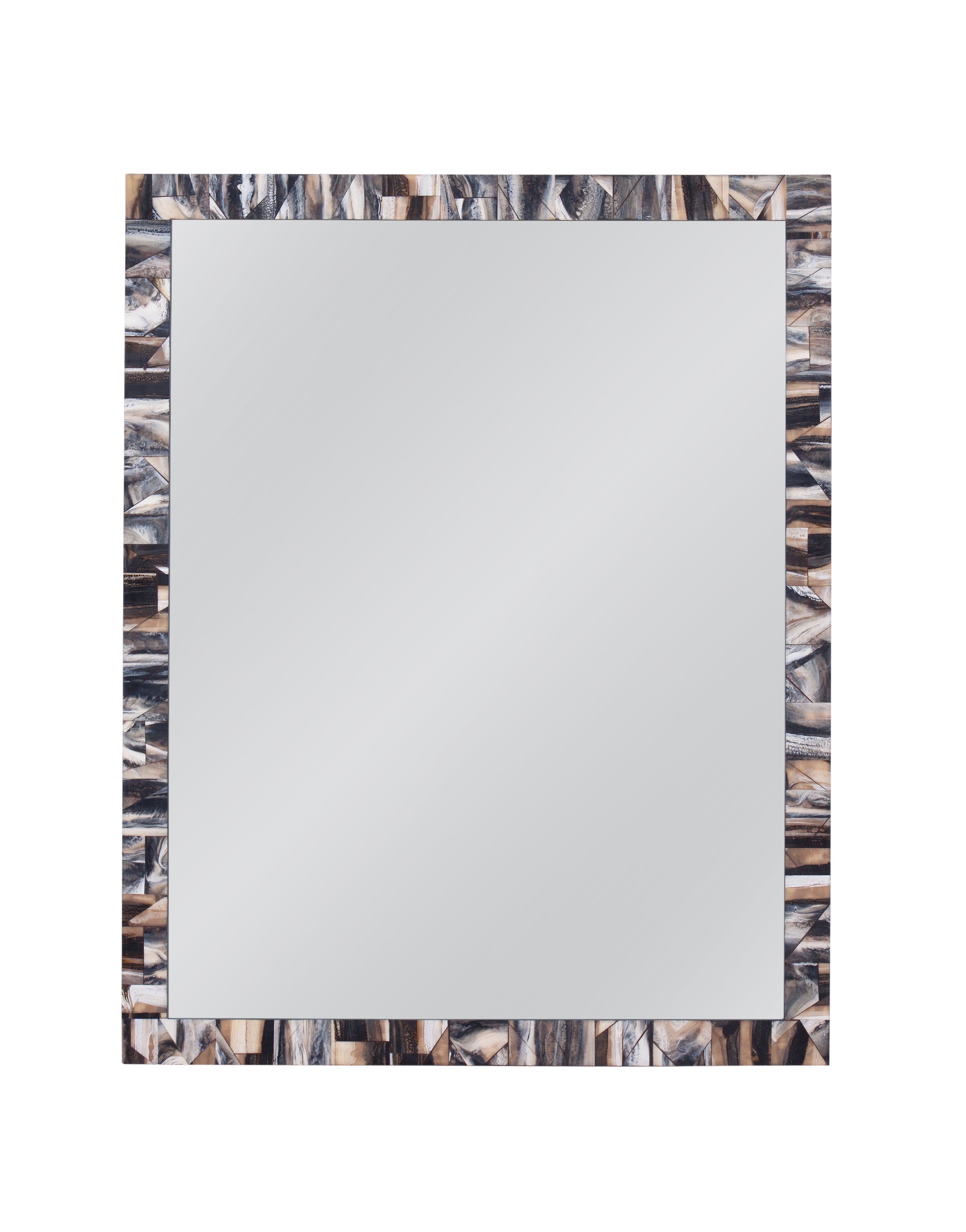 The Kervo Wall Mirror features a contemporary design with a sleek black and cream bone and resin frame. The rectangular shape offers clean lines and a modern look, making it a versatile addition to any room. The combination of bold black and soft cream tones creates a striking contrast, adding both depth and style to your space. The Kervo Wall Mirror blends contemporary design with natural textures, offering a refined and functional accent for your home decor.