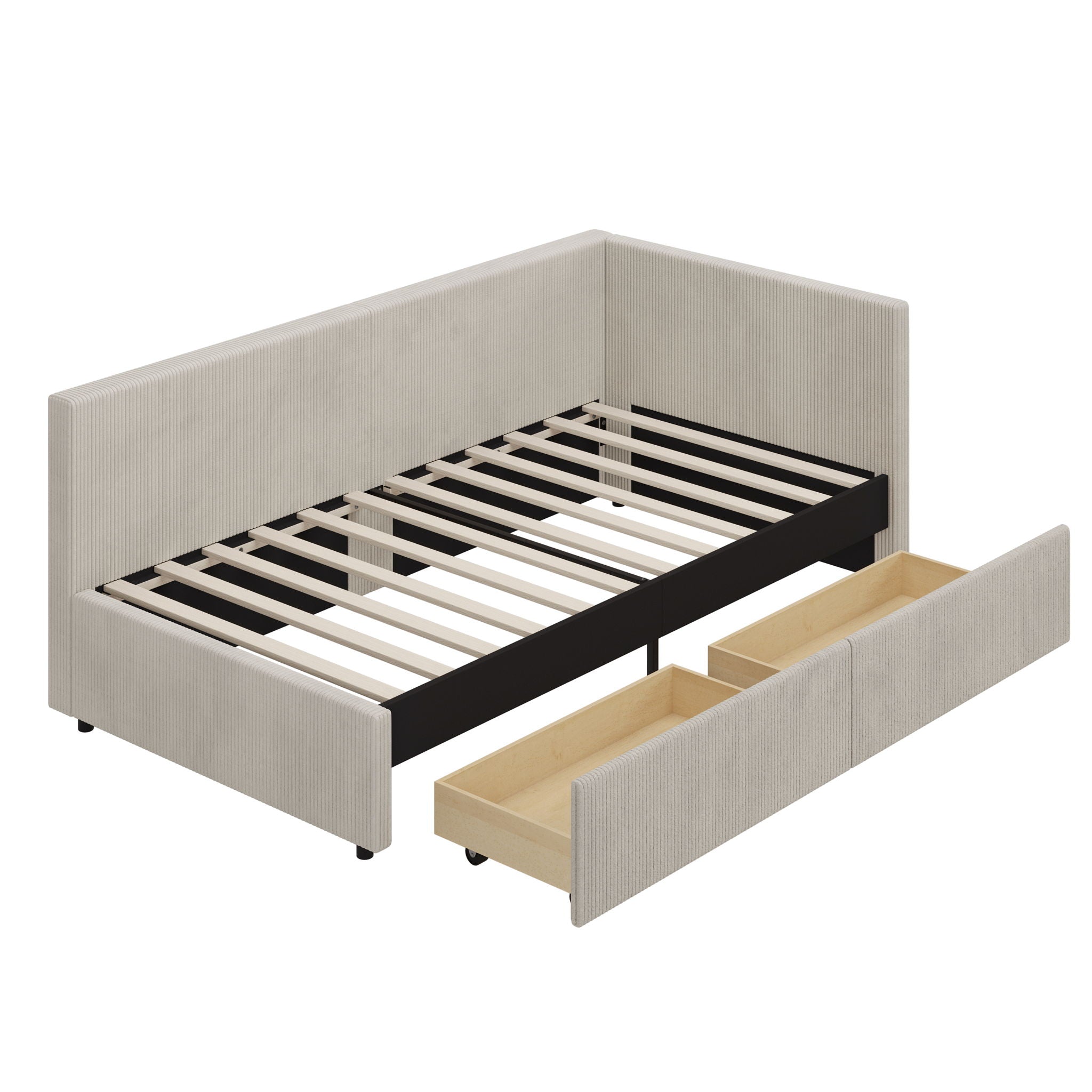 Twin Size L-Shape Corner Bed, Corduroy Upholstered Daybed With 2 Storage Drawers And Vertical Striped Design - Beige