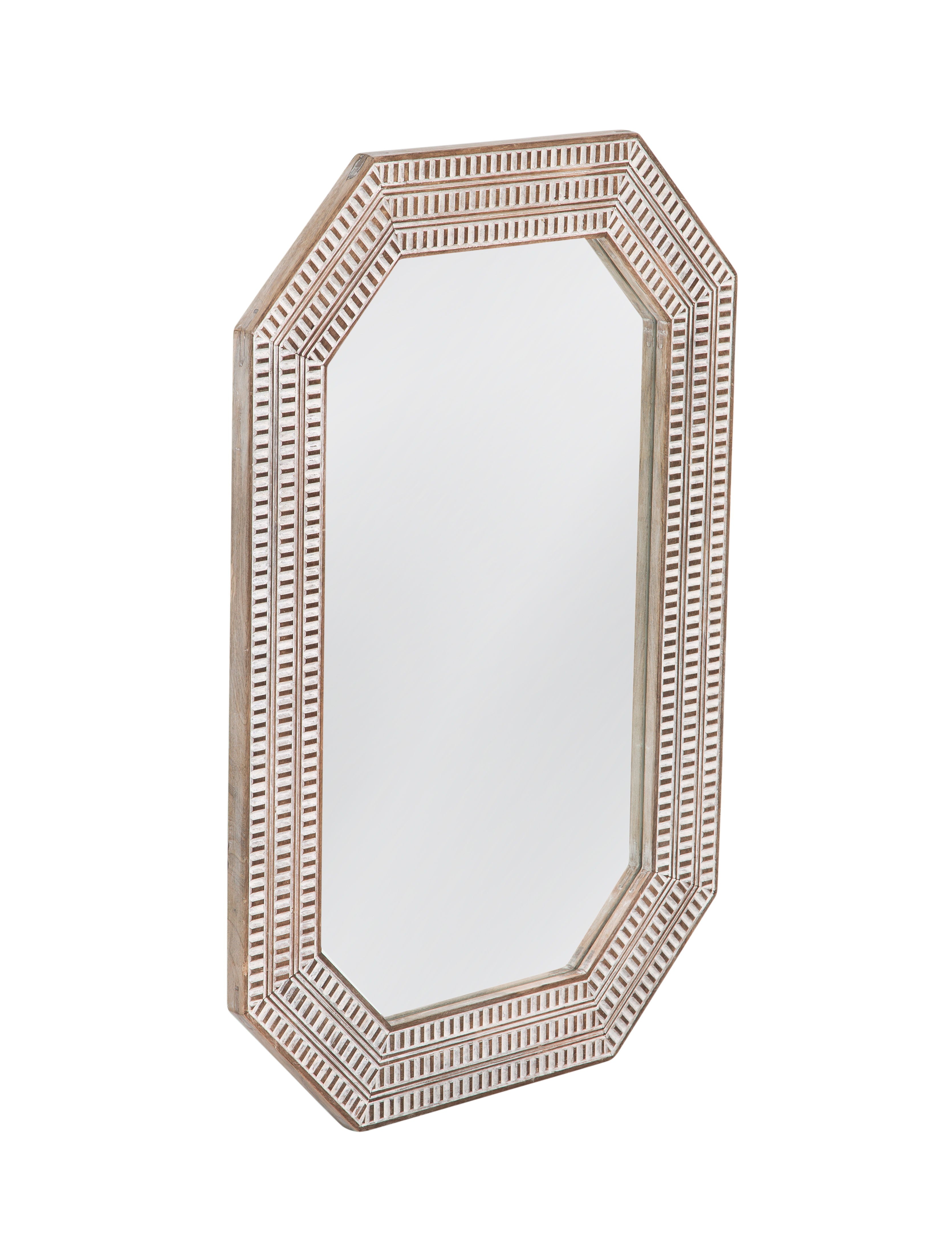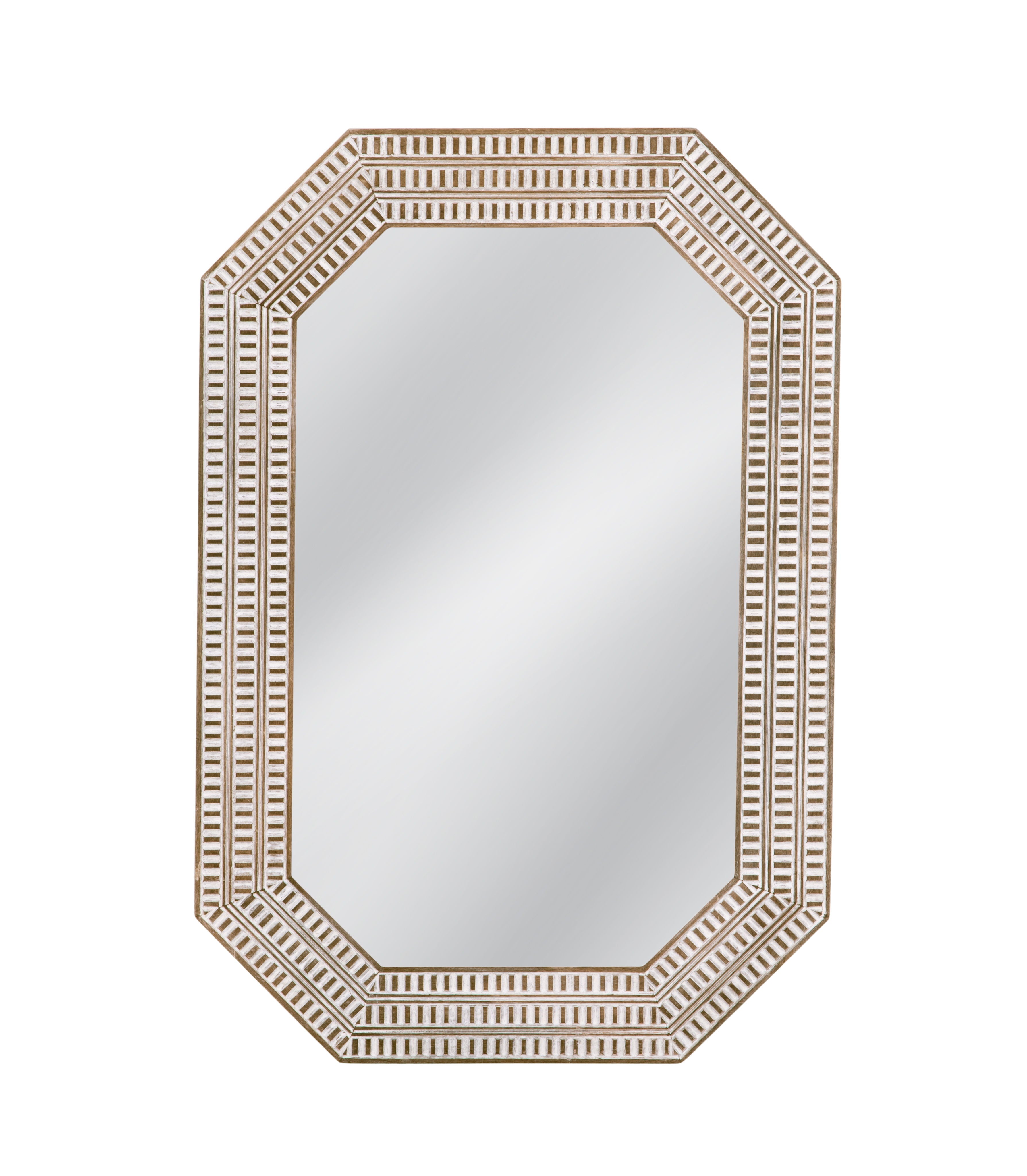 The Michael Wall Mirror features a unique octagonal shape framed by a multi-layered, geometric pattern with a white-washed finish that lends a modern yet distressed look. The intricate detailing around the frame adds depth and texture, which is softened by the whitewash technique, blending rustic charm with contemporary lines. This mirror is a statement piece that would complement a modern interior with its clean, angular silhouette and artistic frame design.