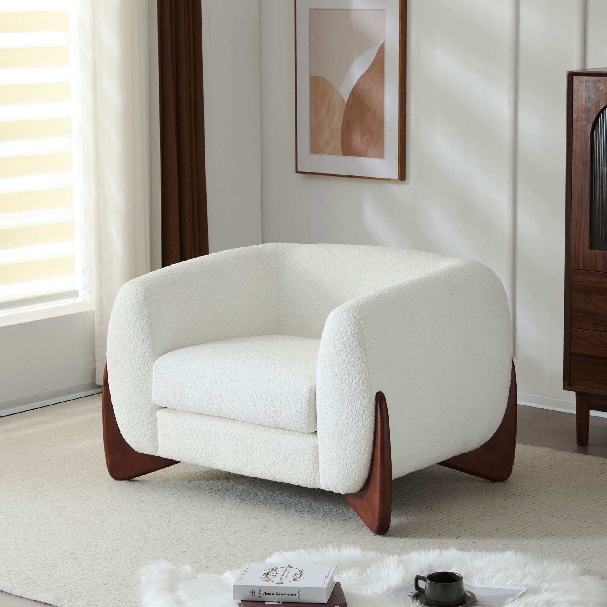 Modern Upholstered Boucle Arm Chair, Elegant Fabric, Solid Wood Frame - White / Walnut