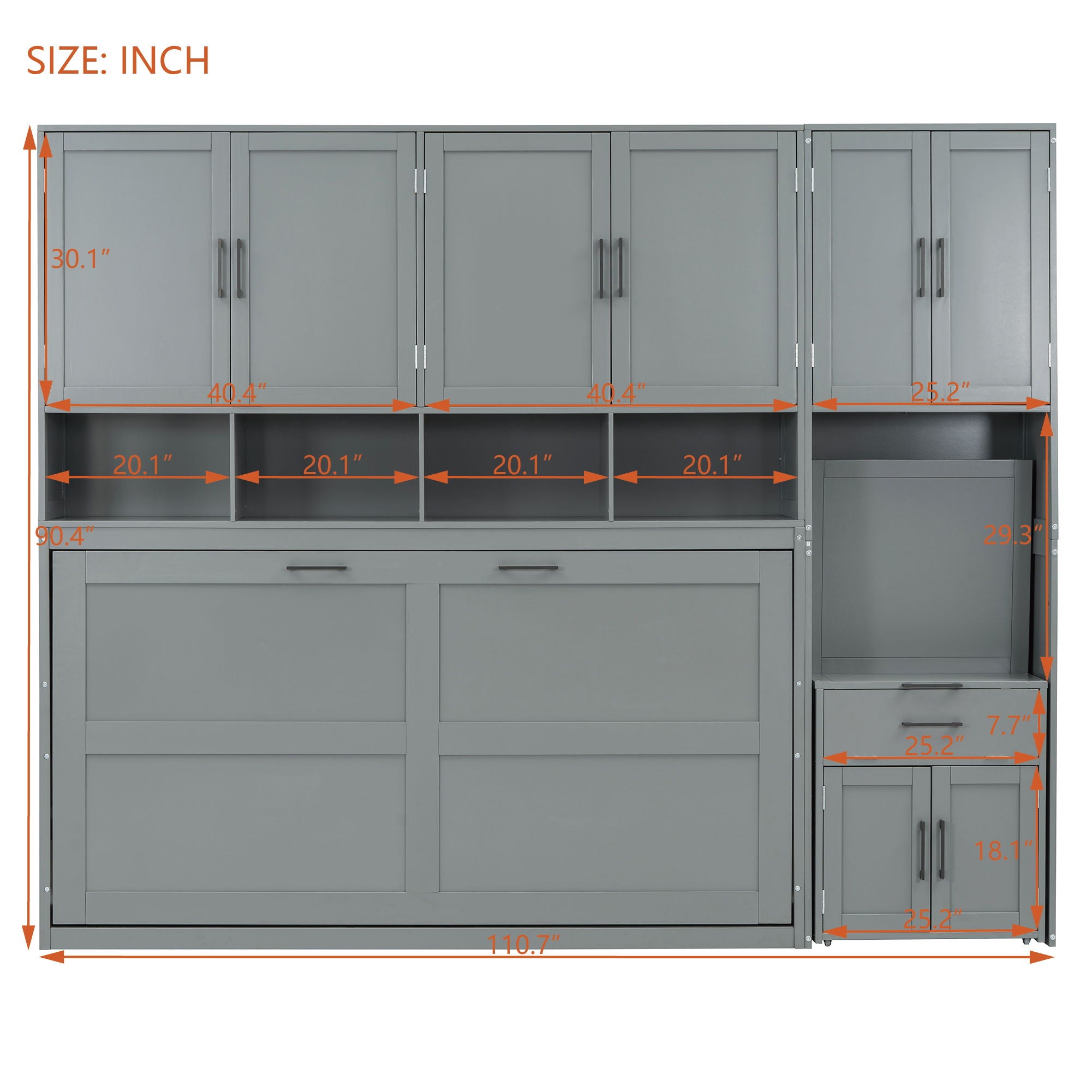 Twin Size Murphy Wall Bed With Closet, Drawers & Desk - Gray