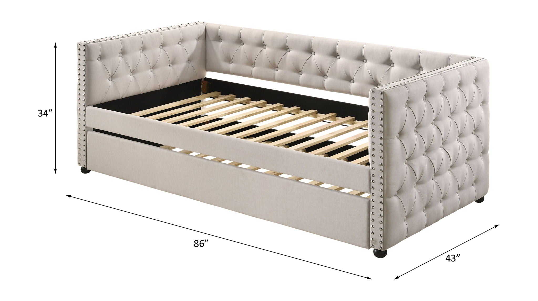 - Design and Material: This daybed features a sophisticated design with button tufting and nail-head trim accents, crafted from a combination of wood, composite wood, upholstered fabric, rubber wood, poplar, and MDF. The elegant color adds a touch of luxury to any room.