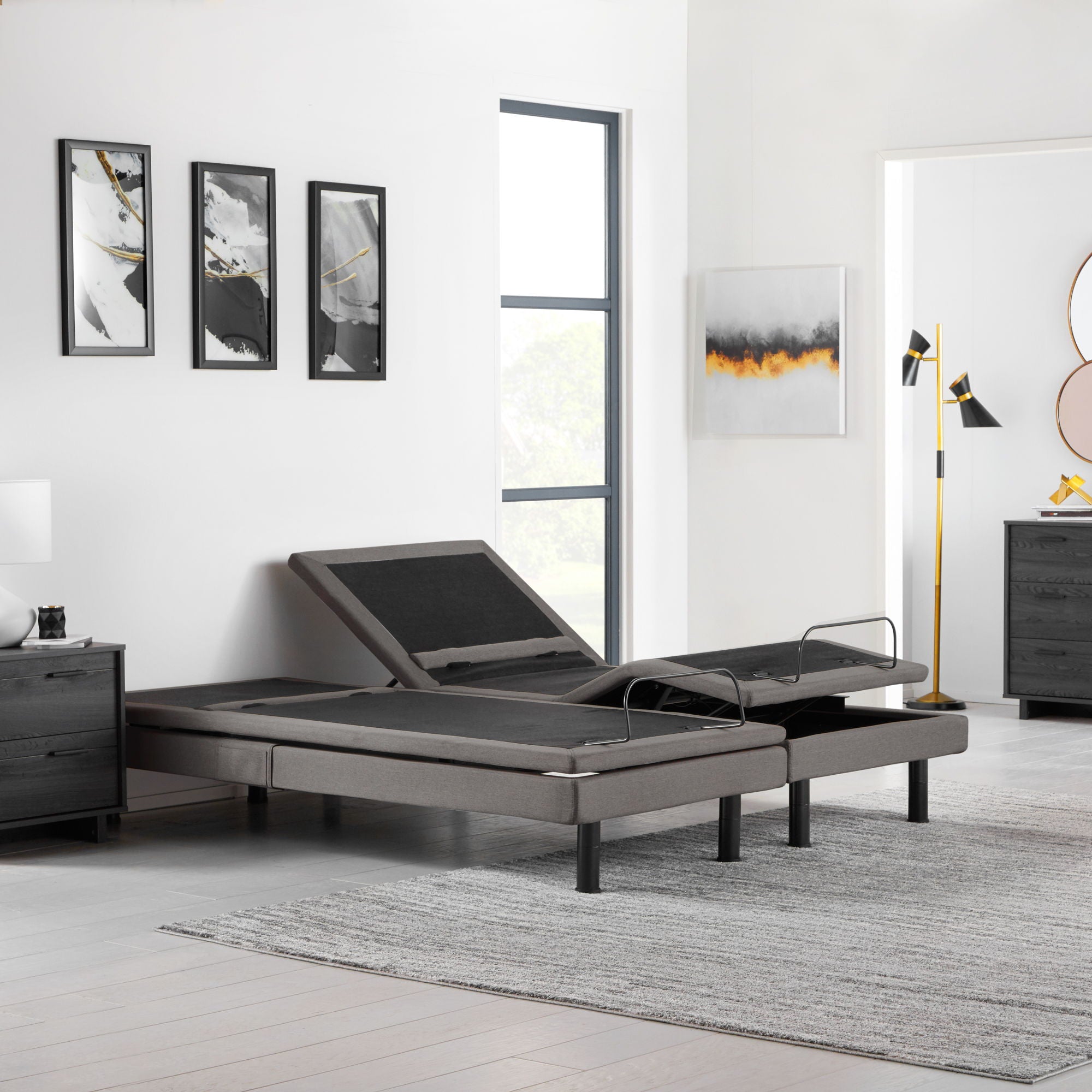 The pinnacle of relaxation and luxury, the S755 Adjustable Bed Base gives you everything you need for a great night’s sleep. Find the perfect resting position with the basic adjustable head and foot panels plus head tilt and lumbar support. The Reach Assist™ feature pulls the bed back toward the wall as you incline for easy access to your nightstand. Built-in Bluetooth® connectivity makes it easy to customize your sleep experience with the MALOUF® Base app (Android and iOS). Additional features include 5 preset positions (Zero Gravity, Anti-Snore, Lounge, TV, and Flat) and six programmable positions that can be customized and saved to match your personal preference. The luxurious massage feature gives you four types, three intensities, and three time settings. Our wireless LED backlit remote control is motion activated so you can simply pick up the remote to light up the buttons. And the underbed LED lights cast a warm glow bright enough for you to see, but soft enough so you stay relaxed. This base also includes a backup battery to power your base in the event of a power outage. To top it off, the sleek, lined-inspired upholstered frame in Stone looks great on its own or fits into most existing bed frames. Since it’s true zero clearance, it can sit directly on foundations, platform bases, slat beds, or the ground.