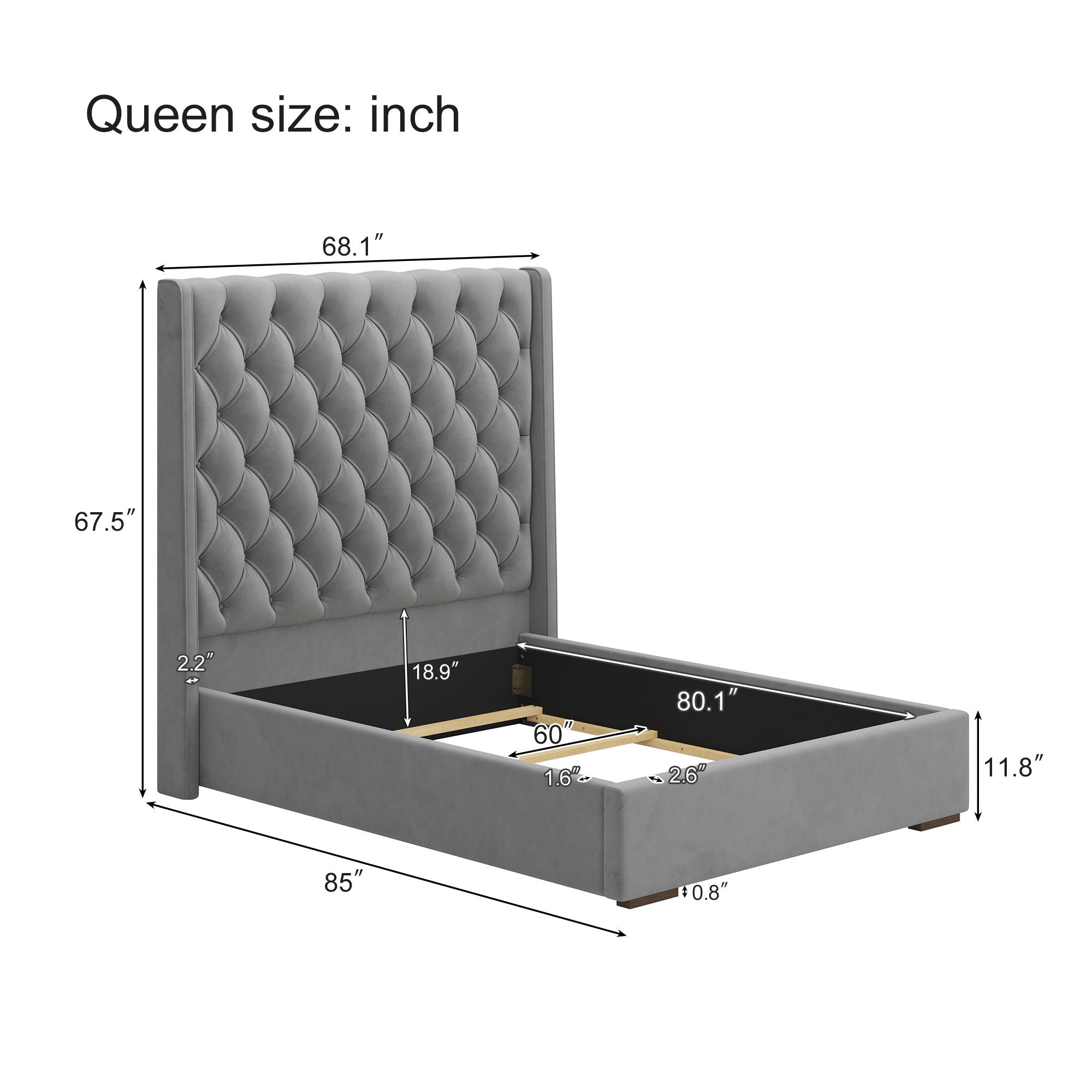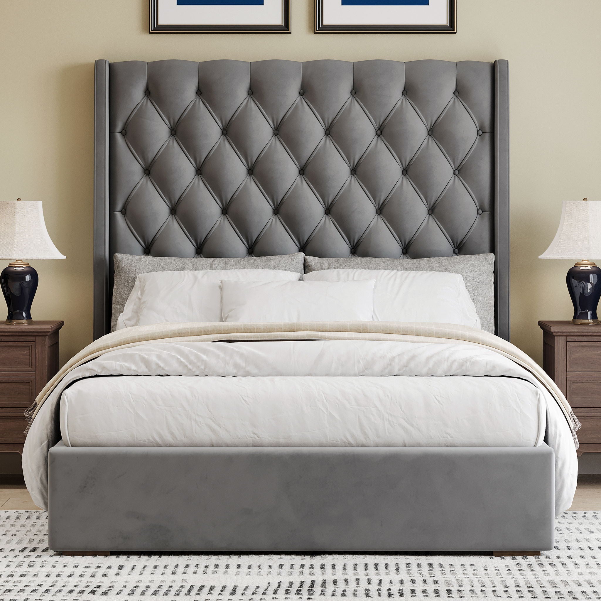 Tall Headboard Upholstered Queen Size Bed With Handmade Deep Button Tufted, Box Spring Needed, Velvet - Gray