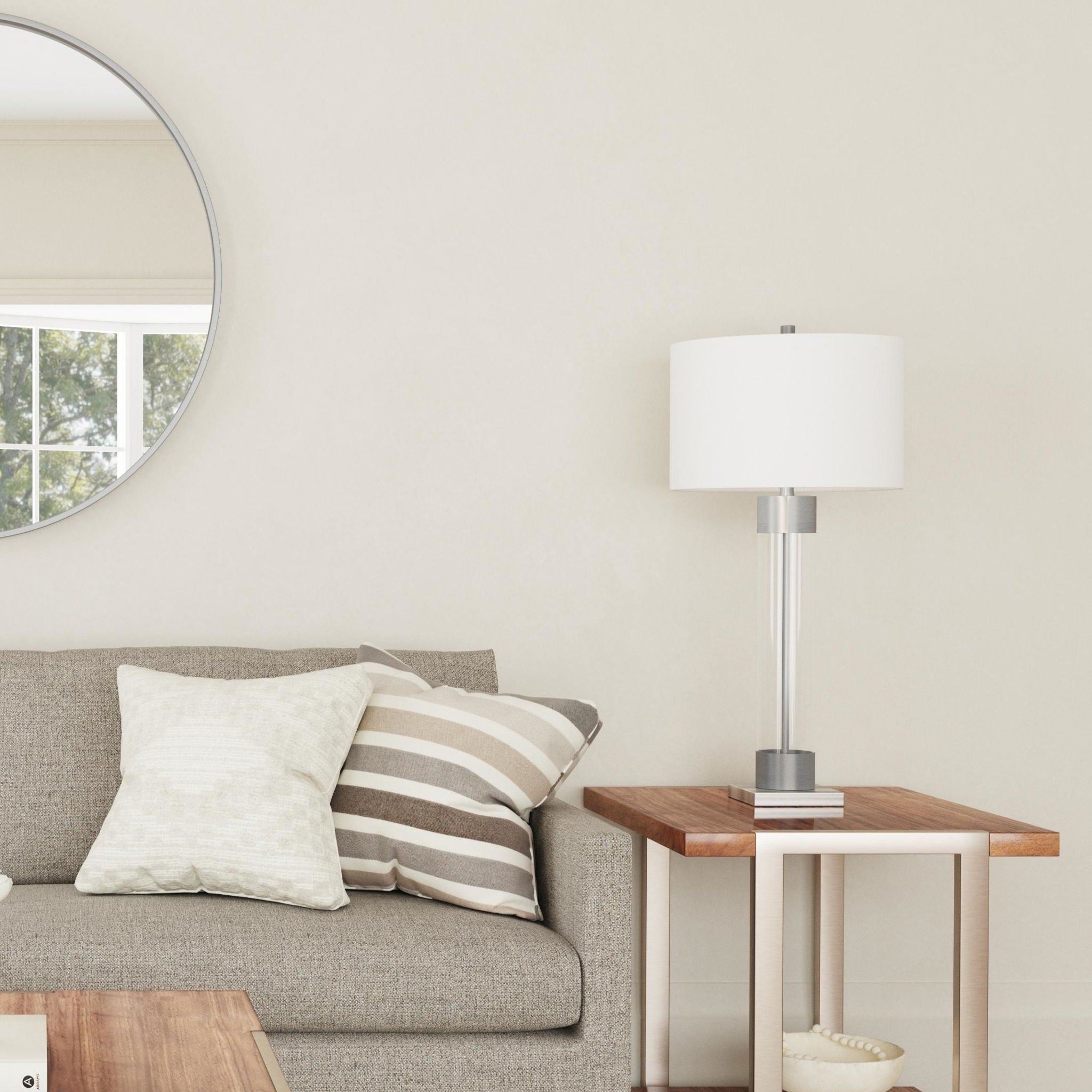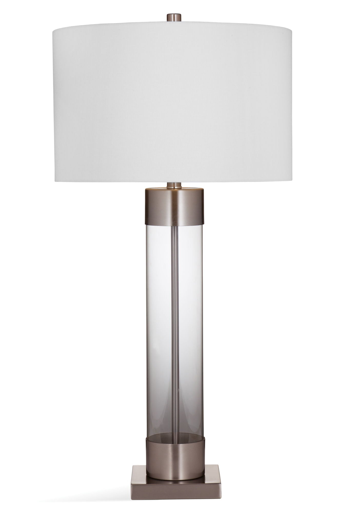 The Tennison Table Lamp is crafted of clear glass and brushed nickel with a white drum shade.