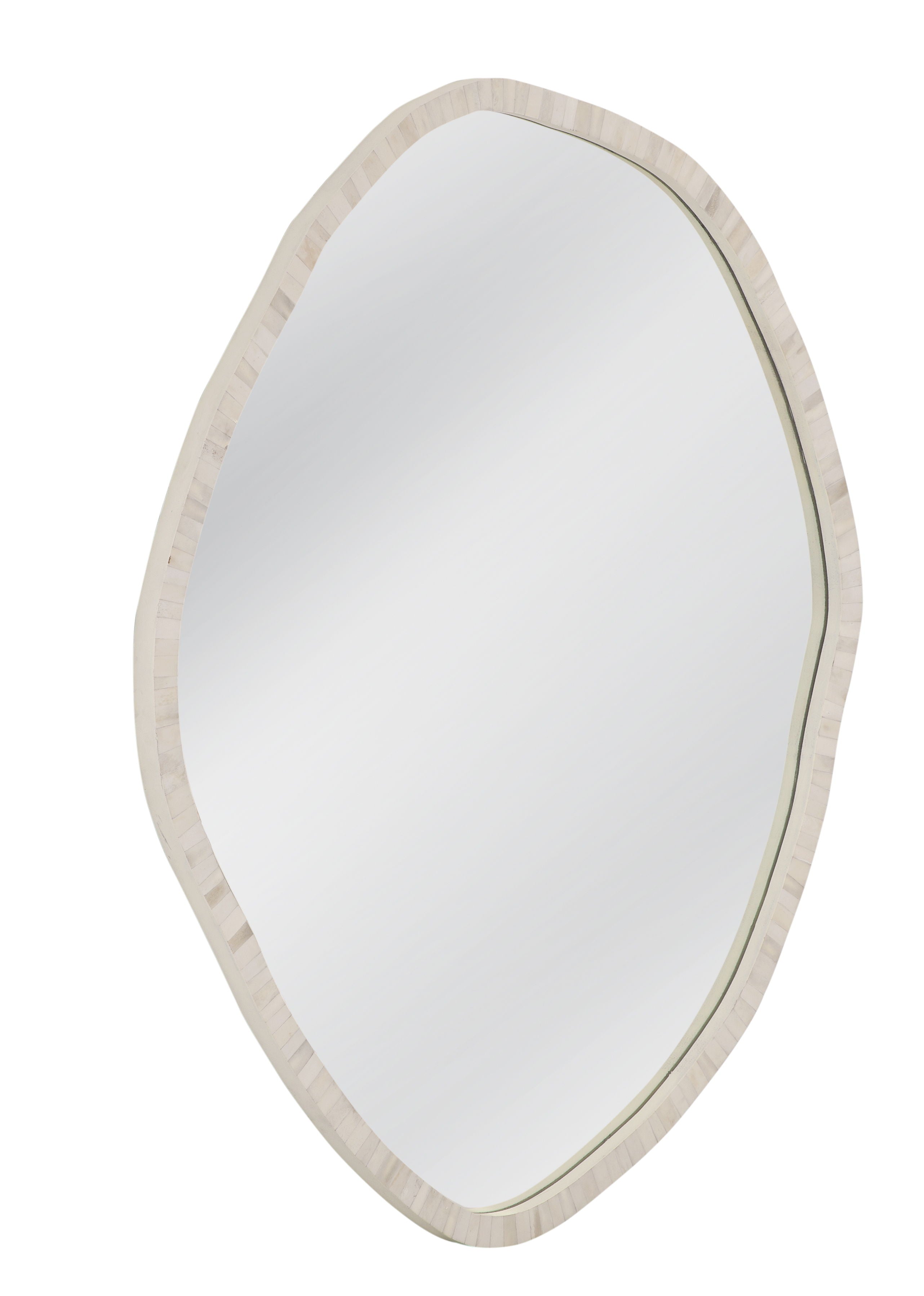 The Tylerton Wall Mirror features an organic shape with a frame crafted from bone and resin in a soft cream finish. The modern coastal design, paired with boho aesthetics, creates a relaxed yet stylish vibe that complements a variety of interior styles. The natural texture of the bone and resin adds depth and warmth, making this mirror a standout piece. The Tylerton Wall Mirror brings a touch of laid-back elegance to your space while offering both beauty and function.